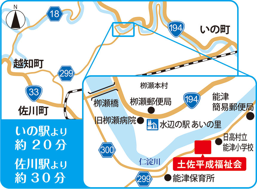 【法人本部所在地】 〒781-2164 高知県高岡郡日高村本村字土橋5-5 【お車でお越しの場合】 道の駅「あいの里」から車で約3分 JRいの駅より車で約20分、JR佐川駅からは車で約30分です 【公共交通機関をご利用の場合】 とさでん交通 県交北部交通 八代(西バイパス)・朝倉~伊野駅・狩山口・土居・長沢線 堺町停留所から柳瀬停留所下車ののち施設車両で送迎 (所要時間:60分) JR伊野駅前より県交北部交通柳瀬停留所下車ののち施設車両で送迎 (所要時間:30分)