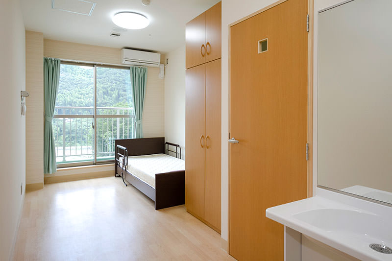 ワンルームタイプの個室にはベッド・エアコン・洗面台・収納・トイレが完備されています。 |