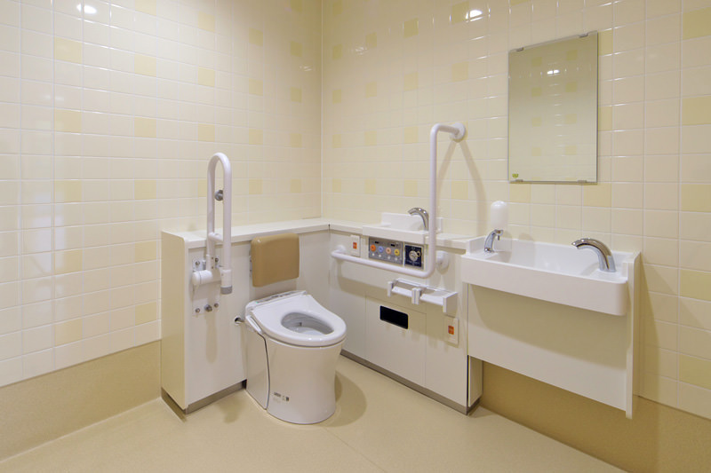 広い身障者用トイレは、車いすが余裕で方向転換できるスペースを確保しています。 |